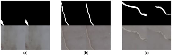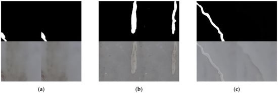 The most popular ML models for crack detection are support vector machines (SVMs) [,], artificial neural networks (ANNs) [,] and random forests (RFs) [,]. In ML methods, crack detection is usually accompanied by crack type classification, including the preprocessing step of feature extraction. Even though ML methods are effective, higher-level features are needed to better handle the complex data in images, such as illumination variations []. DL methods can better handle such complex information since they can learn the features directly from the data. Convolutional neural networks (CNNs) are, therefore, commonly used for crack-detection tasks, supporting classification, object detection and image segmentation [,,,,]. Segmentation methods can lead to a more precise crack localization aided by parallel growth and higher advances in current remote sensing technologies (cameras) that can provide higher spatial and spectral resolution data. Moreover, the extracted crack location can also be used for crack type classification or to extract essential crack features. Therefore, DL segmentation methods are currently the trend in crack detection.