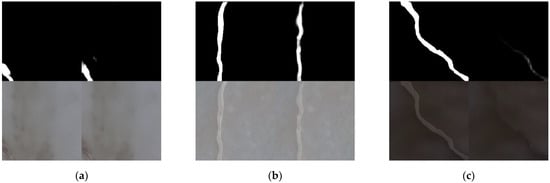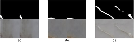 In order to perform marble crack segmentation, a crack dataset was formulated. The original marble crack dataset, namely the Marble Crack Segmentation (MCS) Dataset, and annotations are available online at https://github.com/MachineLearningVisionRG/mcs-dataset (accessed on 26 September 2022). The dataset was a reformation of the dataset for marble surface anomaly detection 2, provided by Aman Rastogi []; only the images of the “crack” folder of the train and test set were used. Both folders contained augmented images due to the scant availability of crack images. All augmented images were removed, resulting in 246 original RGB images of 256 × 256 pixel size. Cracks in the images were manually annotated using the LabelMe annotation tool [].