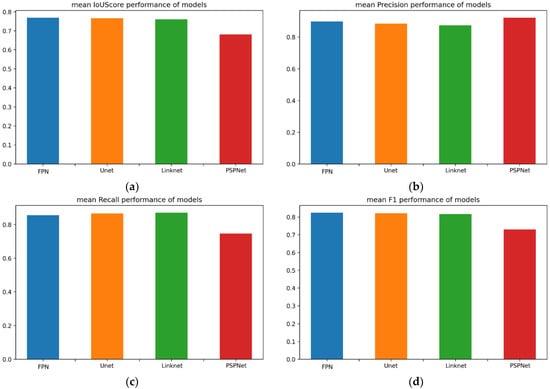 In this work, four deep CNN models were selected: Feature Pyramid Network (FPN) [], LinkNet [], Pyramid Scene Parsing Network (PSPNet) [] and U-Net []. The selection was due to the powerful capabilities of the models for feature extraction, learning representations and their end-to-end trainable structures. Moreover, all models were widely used recently in various segmentation applications, resulting in state-of-the-art performances [,,,].