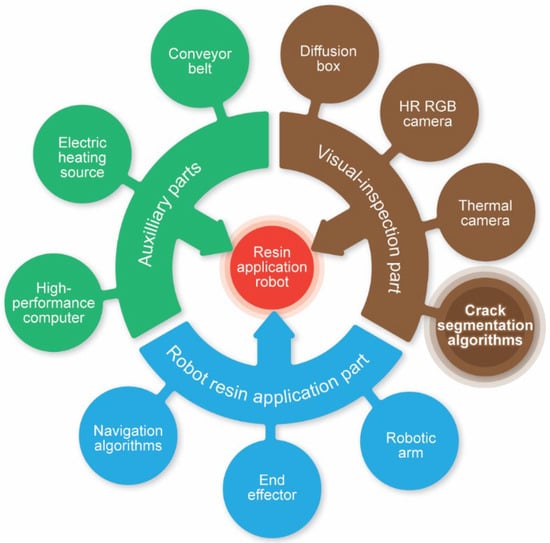 This section outlines the preliminary conceptual design and basic components of an autonomous robot for resin application in marble slabs for the healing of surface cracks. The development of the proposed DL algorithm for the visual localization/detection of cracks in marble tiles is meant to be integrated in the system’s design. In what follows, assumptions to determine the general preliminary framework of the robotic system to be developed are made. Therefore, the proposed system may consist of the following three main parts: