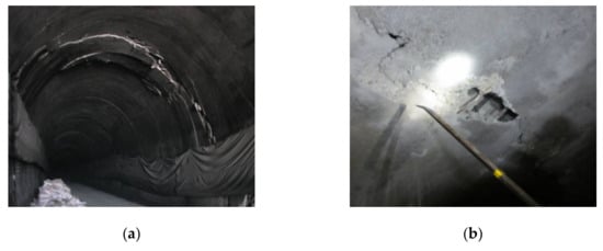 Tunnel linings which are widely distributed have changeable geological conditions, and they face complex service environments. Due to different having construction years and different standards, as well as uncertain levels of construction quality, there are many types of hidden diseases in the lining of running tunnels, such as cavities, voids, lack of density, and cracks. The existence of hidden diseases in linings makes it difficult for the mechanical properties of tunnel structures to reach their design values. In the light, the maintenance cycles and service lives of tunnels are shortened. Under weight, when a tunnel’s structure is damaged, diseases of the lining can be induced, such a split lining, a blockage, or even a collapse, as shown in Figure 1, all of which threaten the safety of vehicle operations. Therefore, effective detection methods are urgently needed to detect hidden diseases in tunnel linings and provide the basis for tunnel disease control.