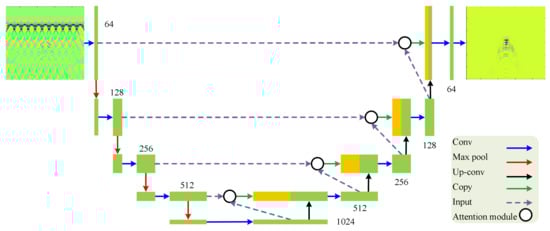 In order to effectively suppress the rebar interference in the input data, this paper plans to add an attention module from the Unet structure, as shown in Figure 4. A Unet structure is divided into two symmetrical parts: the left half of the network is mainly used for feature extraction and the right half is up-sampled. Such a structure is also called an encoder–decoder structure.