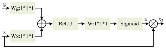 In addition, the black circle in Figure 4 represents the attention module and the purple arrow is the input of the attention module, while the structure of the attention module is shown in Figure 5. Before the shallow features are copied and stitched with the deep features after up-sampling, the shallow features x and deep features g are input into the attention module and the obtained attention coefficient a is multiplied with the shallow features x and stitched with the deep features after up-sampling.