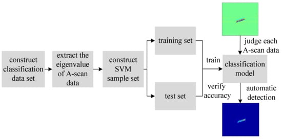 The processing chain of automatic disease detection is shown in Figure 7. As the SVM algorithm is based on the training of positive and negative samples to complete the disease detection, this paper randomly extracts 120 A-scan data without rebar interference from the data set built in Section 2.2 to form a classification data set in which the first 60 are non-disease data and the last 60 are disease data. Among the disease data are four types of common hidden diseases in tunnel linings: cavities, voids, lack of density, and cracks.