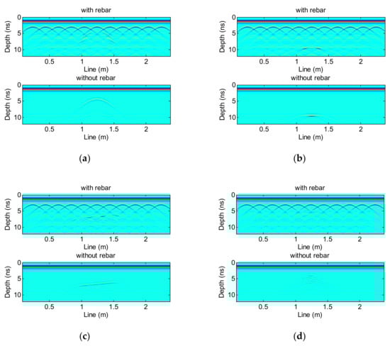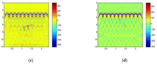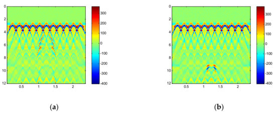 In order to provide the data set needed for training the network, this paper first establishes a paired disease model, with and without rebar, whose other parameters are exactly the same. Then, GPRMAX software is used to simulate the paired disease model. The parameters of the simulation are shown in Section 3.1. The paired simulation results, shown in Figure 3 (taking the lack of density disease as an example), are used as the input data and output data of the network, respectively. Considering that deep learning requires a large amount of training data, 40,000 pairs of disease models are established in this paper. Among them are four types of common hidden diseases in tunnel linings–cavities, voids, lack of density, and cracks—with 10,000 pairs for each disease type.