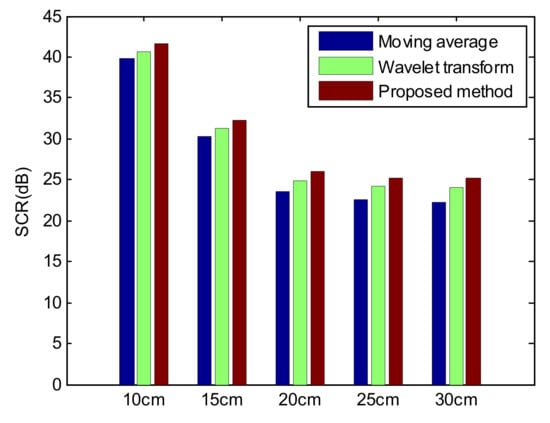 Figure 10 shows the clutter suppression results for each of the four diseases using the proposed clutter suppression method. Obviously, the clutter is largely suppressed. In order to further analyze the advantages of the proposed method, a comparative experiment is carried out. Taking a void disease as an example, the disease has different burial depths. Figure 11 presents the signal-to-clutter ratio (SCR) at various burial depths and for different clutter suppression methods (moving average [33], wavelet transform [34], and the proposed method). It is clearly seen that the proposed method is superior to the other methods.