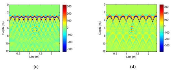 In this paper, GPRMAX software [32] is used to simulate hidden disease in tunnel lining. Considering the cost of the calculation time, the model size is set as 2.5 m (line direction) × 0.65 m (depth direction). The radar antenna scans from left to right on the upper boundary of the model. The center frequency of the radar antenna is 900 MHz, the input signal source is a Ricker wavelet, and the antenna is air-coupled. The time window is 12 ns, the radar antenna scans from left to right on the upper boundary of the model (moving 2 cm each time), and 115 signals are collected.