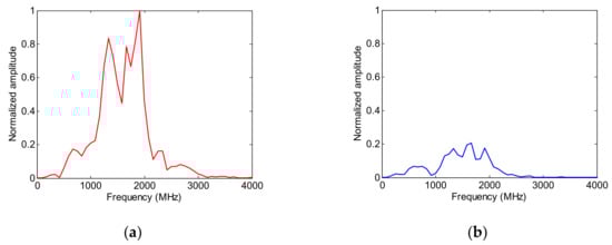 As the attenuation of high-frequency electromagnetic waves in concrete medium is faster than that of low-frequency electromagnetic waves, the proportion of low-frequency components of non-disease data increases and the distribution is relatively scattered. The spectrum variance can reflect this regularity, and so this paper uses the spectrum variance as the identification feature of the disease in the frequency domain. Figure 15 shows the spectrum of Figure 14, with the amplitude of each frequency component in the spectrum of the non-disease data reduced, which is consistent with the time domain analysis.