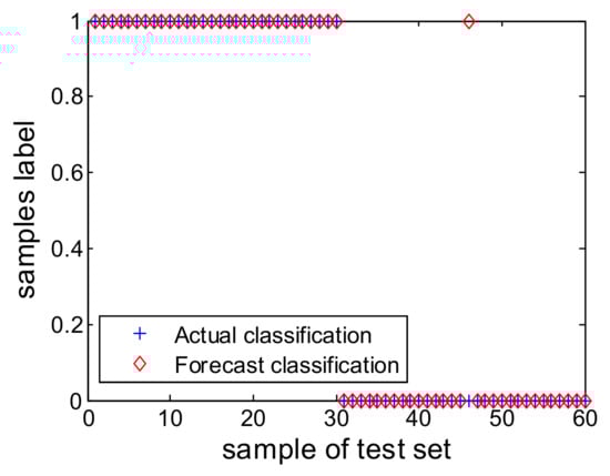 Using the above six identification features, the training set and test set are established according to Section 2.3. An SVM algorithm is used to train the samples of the training set to obtain the binary classification model. The accuracy of the classification model is verified by the test set, and the results are as shown in Figure 16. There are 60 samples in the test set, of which 1–30 are positive samples without disease and 31–60 are negative samples with disease. Only one non-disease signal corresponding to sample 46 is misjudged as a disease signal, and the model’s accuracy is approximately 98.3%.