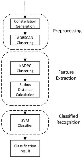 The proposed algorithm including three parts: preprocessing, feature extraction, and modulation type recognition. The block diagram of the modulation recognition algorithm is shown in Figure 1. The preprocessing part transforms the signal to be detected into the form of constellation, uses ADBSCAN to reduce noise, and obtains the noise reduced constellation. In the feature extraction part, K-means is improved by using density peak clustering. Clustering is performed on the constellation after noise reduction and the eigenvalues are calculated to input into the SVM classifier for classification. In the classification part, multiple SVM cascades are used to form a multi-level classifier. The extracted eigenvalues are classified to obtain the recognition results of digital signal modulation.