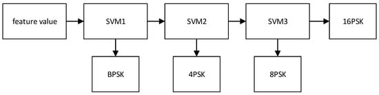 The basic SVM model is a linear classifier with the largest interval defined in the feature space. Since the use of the kernel function method overcomes the curse of dimensionality and the problem of non-linear separability, there is no increase in computational complexity when mapping to a high-dimensional space. The SVM classification algorithm was originally only used to solve two classification problem, and lacked the ability to deal with multi-classification problems. Due to the wide variety of modulation methods, in order to reduce the number of SVM classifiers, one-versus-rest (OVR) SVM is used in this paper. Take BPSK, 4PSK, 8PSK and 16PSK as classification targets to realize multi classification, three SVM classifiers are used to form a multi-classifier as shown in Figure 2, for each classifier is composed of the eigenvalues of the same signal under different SNR.
