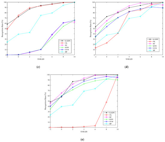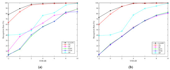 This paper selects several classical algorithms of machine learning and deep learning for comparison, including backward propagation (BP) neural network, fuzzy K-means (FK), random forest (RF), K-nearest neighbor (KNN) and SVM algorithm. Under each SNR, there are 21,000 training samples and 9045 test samples. The recognition rate of BPSK modulated signal under different methods is shown in Figure 5a. It can be seen that the overall recognition rate curve of KADPC algorithm model is better than other comparison algorithms. The recognition rate curve is stable and close to 100% when SNR = 2 dB. KADPC algorithm adds noise reduction and preprocessing. At the same time, under ideal conditions, BPSK signal has only two clustering centers. When KADPC algorithm is used for feature extraction, the difference of eigenvalues is obvious. Therefore, KADPC algorithm is significantly improved compared with other algorithms.