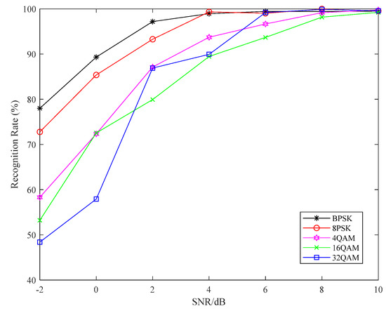 The Recognition rate of different signals. (a) BPSK; (b) QPSK; (c) 8PSK; (d) 16QAM; (e) 32QAM.