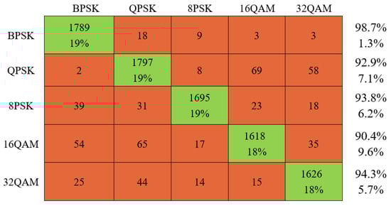 The confusion matrix calculated by KADPC algorithm when SNR = 4 dB is shown in Figure 7.
