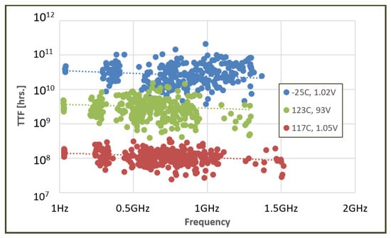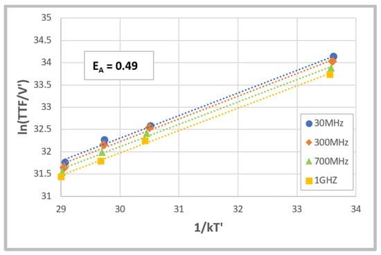 Figure 2 is a collection of MTOL test results arranged to reveal the activation energy of the data set. The data shown are a subset of a larger data set, selected with a focus on the change in TTF values with relatively small changes in frequency. The full data set is provided in [11]. The figure is plotted separately for four frequency regimes. The slopes of all the plots (marked with dotted lines) show an activation energy of 0.49 eV, which is characteristic of BTI. It is apparent from the figure that the TTF values decrease with the increase in frequency. Since the EA slope is constant with increased frequency, the decrease in TTF is caused by increased temperature, i.e., enhanced BTI. Since the x-axis is 1/kT, the increase in temperature due to increased frequency shifts the values to the left. When current flows through the channel due to device operation, phonons develop inversely, corresponding to the thermal conductivity [18,19]. Therefore, temperature changes in the devices are proportional to operation frequency [20]. Raising the frequency causes a temperature change, which exacerbates the effects of BTI on the devices. The voltage constant γ for the data set is 11.7, as we explained in [11]. This voltage relationship fits an exclusively BTI degradation characteristic.