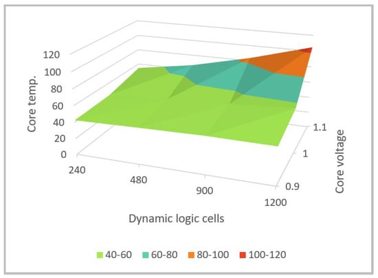 Surface plot showing the increase in core temperature due to dynamic power dissipation with an ambient temperature of 25 °C. The plot shows the temperature increase with the increase in the number of dynamic logic cells, as well as the increase in voltage.