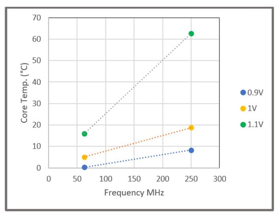 Temperature offset of the chip using open inverter chains. The results include three different core voltages: 0.9 V, 1 V, and 1.1 V.