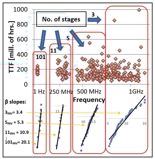 A TTF-to-frequency plot sectioned into four sectors defined by ring sizes of 3, 5, 11, and 101 inverters. The corresponding Weibull plots for the four sectors are displayed below the TTF values for each ring group with their β slope values.