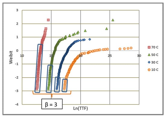 We analyzed the data of the low stress tests, as detailed in a previous study [24]. The results that we received seem to contradict the trend described above. Figure 7 displays a set of four Weibull distributions of three-stage rings tested with a nominal core voltage of 0.85 V. The single distinguishing factor between the stress conditions of the tests presented are the ambient temperatures. Each differs from the other by 20 °C: 10 °C, 30 °C, 50 °C, and 70 °C. The plots are marked with a straight dotted line to mark a β slope of 3. The 70 °C shows a characteristic Weibull distribution with the expected β slope of 3. As the temperature of the test decreases, the data veers more and more from the expected Weibull distribution trend. Since the tests are under low stress, the outcome is easily explained. The TTF is figured from the slope of frequency degradation. When the slope is too slight, the degradation signal is indiscernible from the noise of the system. Therefore, the data veering from the expected Weibull trend does not contribute information to the failure trend.