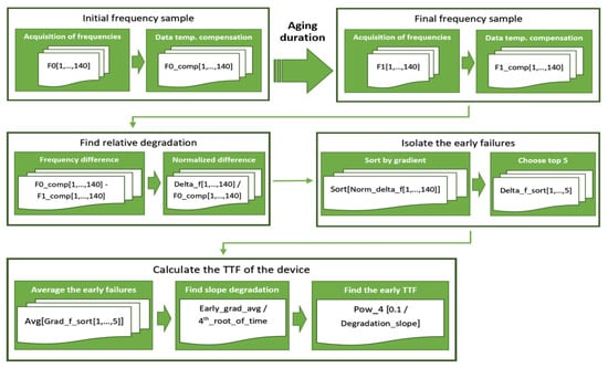 Initially, we attempted to achieve accurate TTF measurements by averaging the TTF values of the 140 rings. This is the procedure used to obtain accuracy in the tests with high stress. In this case, where devices are operating at regular use conditions, the results lacked stability and were unsatisfactory. We concluded that the measurements received were not recording the degradation of the system, but rather system noise. We then developed an algorithm that implemented the noise reduction techniques explained in Section 3. The flow of the algorithm is presented in Figure 8 below. The first two actions detailed in the first level of the flow are acquisitions of the initial and final sample frequencies of all the rings and are stored in arrays F0 and F1. The data extracted are adjusted using the temperature compensation Formulas (7) and (8), and are stored in arrays F0_comp and F1_comp. Next, the normalized displacement of each individual ring is calculated. The difference in frequencies is found by storing F0_comp–F1_comp into Delta_f and them normalizing it by dividing by F0_comp and sorting the results in Norm_delta_f. The normalized differences are sorted using the “sort” function from largest to smallest. The solution is in array Delta_f_sort. We chose the first five values from the array to obtain the early failures. These values were averaged and stored in the scalar Early_grad_avg. This value was divided by the time value, which, in our case, was simply 2 h (since the 4th root of 16 is 2) to obtain the slope degradation. The result was used to calculate the TTF of the system.
