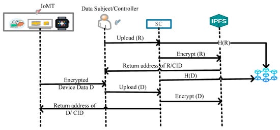IPFS stores the IoMT stream data and other health data such as health reports, prescriptions from doctors, critical diseases history, etc. The critical information that can be used to harm the subject or PII is stored off-chain, and other information can be stored on the blockchain directly. The information of IoMT devices and other information is stored on IFPS, encrypted to provide secrecy. The data are distributed, and at the same time, are secure, and only the data subject can access the data. There are two motivations behind off-chain storage. The first one is to comply with the system against the “Right to be Forgotten” rule under the GDPR to protect the privacy of the data owner. Further, the owner of data has full control over their data. The second one is to reduce the cost of storing data on-chain. The IoMT devices first encrypt the data with their symmetric key and encrypt the symmetric key with the owner’s public key. Then, the encrypted key is stored on IPFS along with the encrypted data. Only the hashes of off-chain data without the actual data are stored on the blockchain. The deletion of data on IPFS to practice the “Right to be Forgotten” right will be discussed in the implementation section. Further, the implementation section also discusses the communication between blockchain and IPFS and the communication of nodes/participants with blockchain and IPFS. Figure 3 illustrates the sequence flow of uploading the data on blockchain and IPFS.