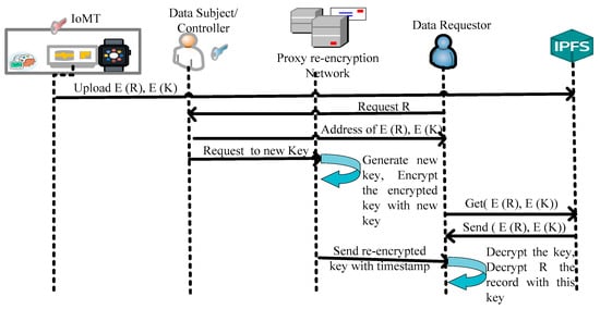 Whenever a participant wants to access the encrypted data, she sends a request to the owner of the data or device (data subject). If the data subject wants to share the data, then they send the address of the IPFS tuple and simultaneously send consent to the re-encryption server to generate the new re-encryption key along with an encrypted symmetric key. There-encryption server then generates a new key with the private key of DS and the public key of the requester. The re-encryption server encrypts the encrypted key with a new generated key and sends the re-encrypted key to the requestor. The re-encrypted key is with a timestamp, which means the key will be invalid after a specified time. The requestor decrypts the re-encrypted key with her private key to obtain the symmetric key. After getting the encrypted key, the requestor decrypts the data and analyses it on the basis of the desired service. Figure 4 describes the sequence flow for sharing the data in the system.