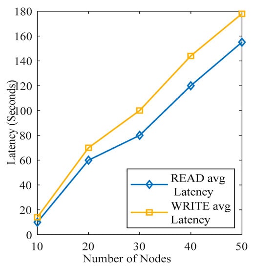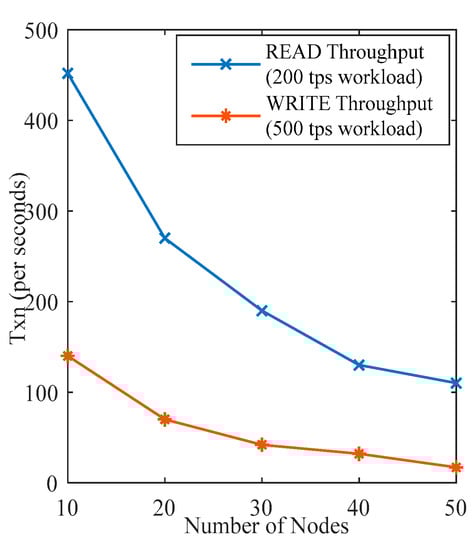 Figure 5 and Figure 6 present the latency and throughput of the READ WRITE operation on the blockchain. As presented in Figure 5, the WRITE operation takes more time than the READ operation. In READ operation, users throw a query via smart contract or other user interaction method and get the results. Whereas in WRITE operation, the user updates some data on a ledger or off-chain storage. The consensus algorithm also runs to sync up all nodes’ data after a defined time. So, the whole process takes time greater than the READ operation. Further, the READ and WRITE operation time also increases with the increment in the number of nodes. As the number of nodes increases, the search time also increases in the case of the READ operation and WRITE time also increases accordingly. The throughput of the network is calculated on 200 TPS and 500 TPS workloads on READ and WRITE operations, respectively. As the number of nodes increases, the throughput for READ and WRITE operations decreases. Because, as the number of transactions per second increases, the database also increases, so the system takes more time to process the operations.
