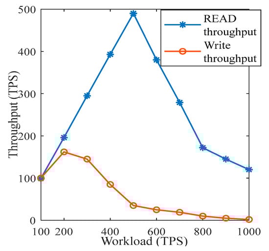 The performance of READ and WRITE operations in the system is described in Figure 7. The throughputs of READ and WRITE operations on different workloads of 100 TPS, 200 TPS, 300 TPS, 400 TPS, and 500 TPS were collected to calculate the performance. As shown in Figure 7, the WRITE operation got the highest performance on a 200 TPS workload, and it was 157 TPS. Then, the performance started degrading as workload increased. In contrast, the READ operation performed best on 500 TPS as 498 TPS. After that, the performance started to degrade.