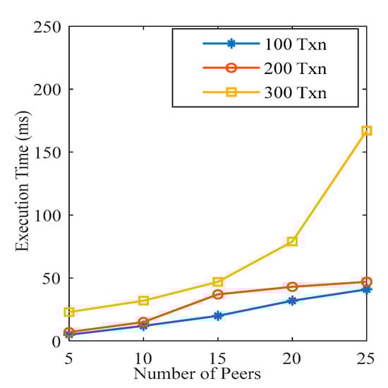 The smart contract is deployed on the blockchain, and nodes trigger queries through a smart contract for different functionality such as storing the IoMT data, deleting the record on IPFS, requesting to share the record, etc. An increment in the number of nodes increases the number of smart contract queries, leading to a slowing down of the execution process of queries with the existing computation resources. As shown in Figure 8, the execution time of a smart contract increases with the increment in the number of nodes participating in the network.