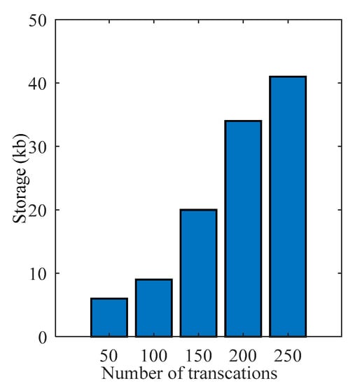 The first comparison is between the computation and storage throughput with Healthchain [22] and the traditional system. The Healthchain takes 8.565 ms to generate the user transactions, and the traditional system takes about 130 ms. We analysed our system and found that it takes only 6.098 ms to generate the user transaction when only ten nodes are present in the network. Figure 9 represents the same. As the number of nodes increases in the network, the time to generate the transactions also increases. When the number of participants increases in the system, the number of transaction requests per second also increases. The increased transactions take time to compute with the existing computation resources. It complies that computation time and storage of the system increase with the extra number of participants. The computation time and storage were measured when the number of transactions was 50, 100, 150, 200, and 250 in the network. Figure 9 represents storage overhead as the number of transactions varies. The figure illustrates that as the number of transactions increases, storage overhead also increases.