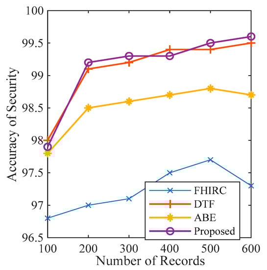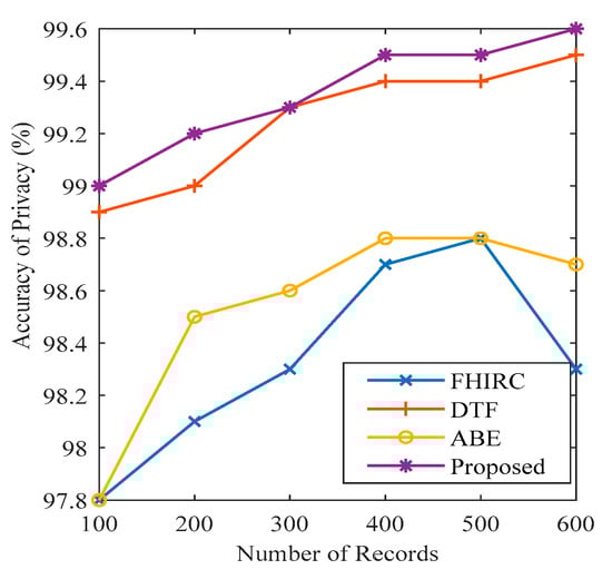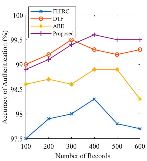 Figure 10, Figure 11 and Figure 12 depict that the proposed framework ensures high accuracy in terms of security, privacy, and authorisation. These parameters are observed and compared with the previous work. Figure 10 presents the accuracy of security of the proposed framework along with the security accuracy of the FHIR Chain (FHIRC) [35], Attribute-Based Encryption (ABE) [36], and the Decentralised Telemedicine Framework (DTF) [27]. The results show that the proposed framework possesses high security accuracy (99.6 per cent) when the number of nodes is 600. At the same time and with the same number of records, DTF has 99.5 per cent, ABE has 98.5, and FHIRC only has 97.3 per cent security accuracy. Maximum authentication privacy is observed at 99.5 per cent when the number of records is 400, as presented in Figure 12. Maximum privacy accuracy is 99.6 per cent when the number of records is 600, as presented in Figure 11. The privacy and authentication accuracy are compared with FHIRC, ABE, and DTF. The results show that the proposed system has high accuracy compared to the state-of-the-art techniques.