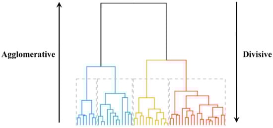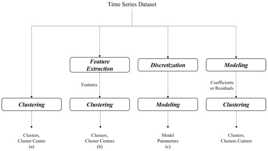 Figure 2 shows three different approaches: raw-data-based, feature-based, and model-based. Note that the left branch of the model-based approach trains the model and uses model parameters for clustering without needing another clustering algorithm. Unlike a raw-data-based approach, a feature-based approach has steps to extract features, allowing researchers to effectively understand characteristics of the data. A model-based approach clusters by extracting model parameters or determining coefficients and residuals through various models. This approach allows researchers to proceed with the clustering process and use several general-purpose clustering algorithms to cluster according to the given data [,,].