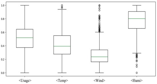 In this study, time series power data are clustered to predict and analyze power data. The dataset used in this study is data that store power consumption provided by the Korea Energy Agency. The electric power usage of 60 buildings was recorded every hour from 1 June 2020 to 24 August 2020. The column of the dataset is configured as shown in Table 1 below. There are a total of 122,400 rows in the dataset, and no outliers exist. Figure 4 shows a boxplot for each column in the dataset. Outliers were recorded in the wind speed column and humidity column in all buildings, and few outliers were found in power usage or temperature. In this study, the performance of time series data prediction and analysis according to the presence or absence of clustering was compared using the above dataset. Columns other than electric power usage were not used to measure performance under the same conditions and to consider the characteristics of power data. This experiment compared the performance according to the clustering technique performed in the preprocessing process to predict the power consumption dataset in a time series data format.