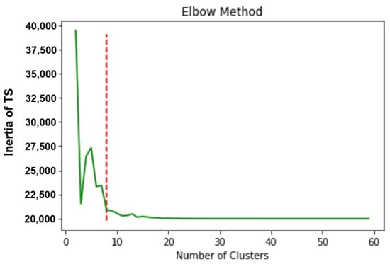 In the pre-clustering step, 60 building power usage data were clustered. To detect anomalies, time series data were clustered to apply the time series feature of each cluster. For detecting an anomaly, we clustered using four methods to explore effective clustering methods. The first was to use only the power usage column. Anomaly detection was performed using only single-dimensional data without separate categorical data. Second and third, power usage data were clustered using the k-means and k-shapes algorithm and separate categorical data were added and used. To set k, clustering was performed from 1 to 60, the maximum number of buildings, and the appropriate k was set using the elbow method. As a result, it was appropriate to set k to 7 as shown in Figure 5. The clustering results using the k-shape algorithm can be confirmed in Figure 6. Fourth, power usage data were clustered using the SOM algorithm and separate categorical data were added and used. To determine the optimal number of nodes and map arrangement, appropriate nodes were obtained using Equation (14) proposed by Tian et al.