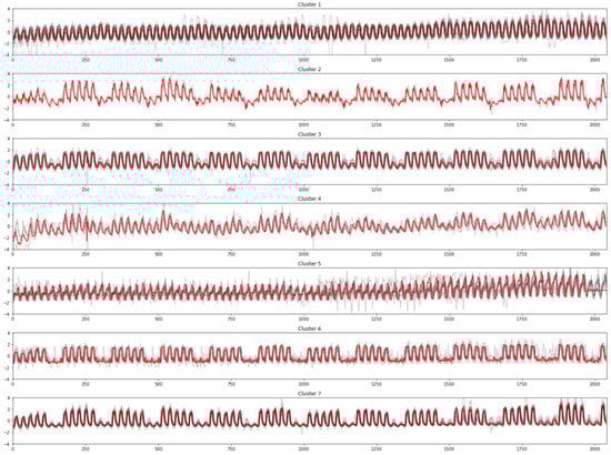 By specifying the number of clusters and weighting coefficient, alternative optimization procedures are repeated to solve the fuzzy c-means model. The fuzzy c-means algorithm works better for time series with the same length. This is because the concept of the cluster center is unclear when the same cluster contains different time series of different lengths [,,]. Various methods using fuzzy and k-means algorithms have been applied and developed for clustering [,,].