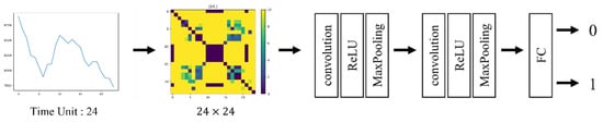 In this experiment, as shown in Figure 9, time series images were generated using RP, GASF, GADF, and MTF algorithms for time series data recorded in 24 h time units. When using the RP algorithm, the cross recurrence plot generates a black and white time series image by substituting 1 if it is greater than a certain distance (element value), but in this experiment, the distance threshold was not used to obtain more information from data in the CNN model. CNN-based layers were designed as shown in Table 2 with the generated time series image to learn a model that classifies normal data and anomalies.