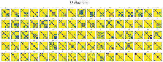 The recurrence plot algorithm is a visualization algorithm that aims to explore the m-dimensional phase space trajectory by expressing the regression of data values in two dimensions [,]. To convert time series data into images using RP, the m-dimensional spatial trajectory of time series data must first be configured. Given the time series data as , the m-dimensional spatial trajectory can be defined as Equation (7) below.