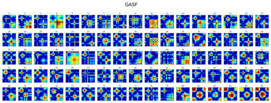Here, N is the normalization constant for the range of polar coordinate systems. GF is divided into two ways depending on the sum and difference of angles. The Gramian angular summary field (GASF) is expressed as the sum of the angles of polar coordinate time series data consisting of time pairs of i and j, and then is defined as Equation (10).