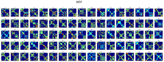 represents the frequency of transition from the interval to the interval. By normalizing the sum of each column of W to 1, the Markov transition matrix can be constructed. In this process, W eliminates the distribution of X and the time dependence on the time index . To overcome the information loss of W, MTF is defined as Equation (13) below by aligning each probability along the time order.