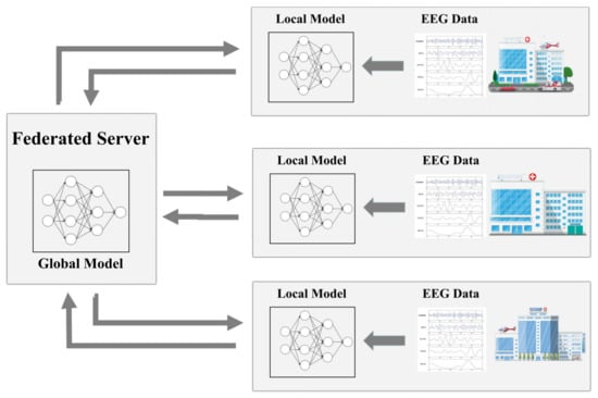 FL has gained the attention and focus of many researchers in the healthcare field, where data privacy is highly valued because it has the potential to address trust and privacy issues arising from the sensitivity of patient data. Brisimi [], in 18, proposed an FL model capable of predicting hospitalizations of cardiac patients using inter-institutional EHR data. In order to enable institutions with small amounts of Melanoma Detection data to collaborate in training the model and to address the problem of poor data availability, Agbley [] extended the FL approach to Melanoma Detection for disease detection. Although the FL algorithm achieves to protect data privacy, it is still possible to attack the uploaded models to obtain data information. Therefore, Malekzadeh [] proposed an FL system based on differential privacy stochastic gradient descent (DPSGD) and secure aggregation to improve the security of FL further. Moreover, with the explosion of COVID-19, the FL-based approach for COVID-19 detection also attracted the interest of many researchers, among which Feki [] combined blockchain and FL approaches to achieve cross-institutional co-training of COVID-19 detection models using CTs of COVID-19 patients. At the same time, Zhang [] designed a dynamic fusion of FL systems to improve the communication efficiency of the FL algorithm for COVID-19 detection accuracy. The application environment of the FL algorithm presents a key data challenge: the distribution of medical data held between different medical institutions is usually non-independently and identically distributed (N-IID). Such N-IID among data has been shown to cause substantial accuracy degradation in traditional image classification domains such as CIFAR-10 or MNIST. However, the N-IID problem of the FL algorithm in EEG data has not been taken seriously [].