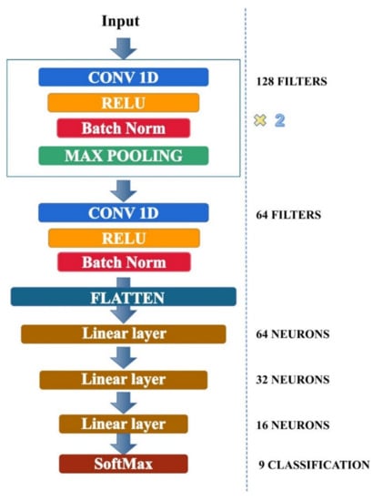 In the experiments of this study, we input the data of shape (70*1) into this network with a convolutional kernel size of 5 and a step size of 1. After the convolutional network operation, the output was subjected to maximum pooling. The pooling layer has a pooling window of 2 and a step size of 1. Going through the pooling layer reduces the dimensionality of the information extracted from the convolutional layer and reduces the computational effort. After the third convolutional layer, the output was pulled into 1 dimension through the Flatten layer and sent to the fully connected layer for further training. All layers in this network use the ReLU function as the activation function, and the output data were normalized to a standard normal distribution with mean 0 and variance 1 by batch normalization to accelerate the model training.