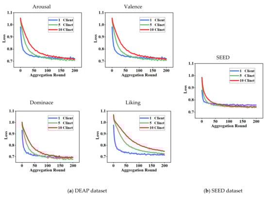 Figure 3 shows the variation curves of the loss function of the FL algorithm with the different number of clients when trained on the DEAP dataset with different labels and the SEED dataset. The total amount of training data is the same, but it is evident that the rate of loss decline of the FL algorithm receives the influence of the number of clients when training on the DEAP dataset. The convergence of the model leveled off at 60 epochs; the convergence rate gradually decreases with the increase in the number of clients involved in federal learning, and the FL model converges to level off only at 200 epochs of aggregation when 10 clients are used.