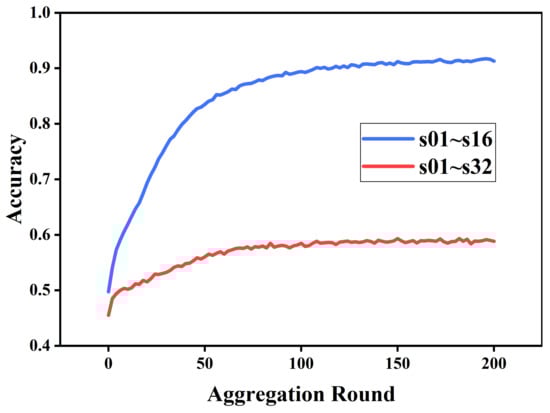 All our experiments were conducted on a Windows 10 computer with an AMD R7–4800H CPU and a GTX1650Ti GPU, and the experimental code was implemented in Python 3.7. We divided each subject’s data in the dataset into 80% training set and 20% test set, and the training data were equally distributed to all clients involved in the federation learning. In contrast, the test set was kept in the server measurement, and the accuracy of the aggregated model was tested and recorded after the completion of the aggregation. In our experiments, we set the optimizer for model training to Adam, the learning rate to 0.001 and the batch size to 2048, and each round of aggregation required the clients to train 1 epoch locally.