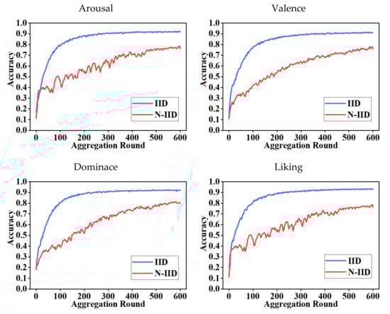 - The impact of the FL method on the accuracy and convergence speed of the emotion recognition model when trained on EEG data with N-IID distribution was evaluated by simulating the N-IID distribution of the inter-client DEAP dataset. Compared with the IID distribution, there is a substantial decrease in the accuracy of the FL-trained emotion recognition model under the N-IID distribution.