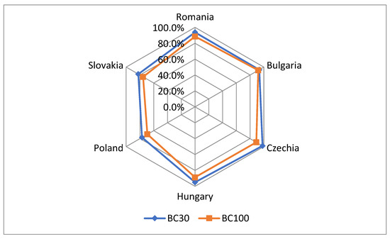 In the year 2021, the European average of households with an FBC connection was 97.9%. Referring to this average, it can be seen in Table 3 that only two countries exceed this value, namely, the Czech Republic (99.9%) and Hungary (98.4%). Slovakia and Bulgaria are close to the European average with a percentage of over 97% of households with a fixed connection, while Romania (94.1%) and Poland (89.7%) are making considerable efforts to reach the targets proposed within DAE.