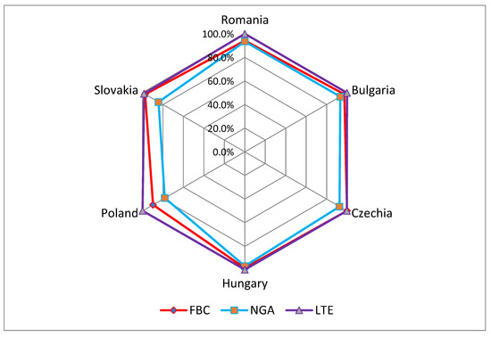 The NGA category comprises technologies capable of delivering a service speed of at least 30 Mbps. This category must be improved considering the main objective of DAE to have complete coverage of European households at this speed by 2020. In Figure 2, it can be observed that this coverage registered the lowest values in the analyzed countries. Therefore, the analysis of the combination category constitutes an evaluation of the rollout of the relevant technologies and progress toward this goal. The European average for NGA is 90.1%. Of the six countries included in this research, only two are below this value (Slovakia—84.3% and Poland—78.2%).