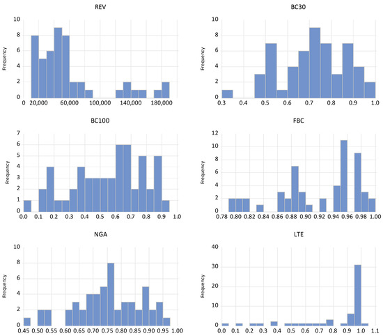 To analyze the descriptive statistics of the variables included in the model, it was necessary to use the raw data of the variables, not the transformed data. The descriptive statistics of the variables included in the research and presented in Table 1 have the purpose of measuring central tendency (mean and median), dispersion (standard deviation), and normality (Skewness and Kurtosis) of selected data [25]. Analyzing the Kurtosis normality indicator, we can see that for the variables REV and LTE, we have a leptokurtic distribution; for the other variables, we have platykurtic distribution, which is very close to normality. Regarding the skewness normality indicator, it can be easily observed that the distribution is asymmetric around its mean, all the independent variables present a long left tail (given by the negative values of the skewness) and the dependent variables REV present a long right tail. The values of the Jarque-Bera test and the associated probabilities for each of the variables confirm the null hypothesis of a normal distribution.