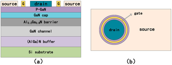 (a) Cross-sectional view and (b) top view of ring-gate AlGaN/GaN HEMT device.