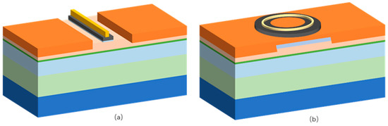 Optimizing the source-drain electrode structure and fabrication conditions of AlGaN/GaN HEMT devices can improve the ohmic contact characteristics, thereby improving the electrical properties of the device. We prepared 8 groups of devices as shown in Table 1, and explored the effects of electrode alloy materials and source-drain grooves etching depth on device performance. The area of the groove etching area is smaller than that of the source-drain electrode itself, as shown in Figure 5a,b, the source, drain electrodes of conventional devices are 143 × 140 μm rectangles, while the groove etching area is 120 × 130 μm rectangles; the radius of the drain of the ring-gate device is 63 μm, while the radius of the groove etched region is 58 μm, and the etched groove under the source is a square of 130 × 130 μm. The source and drain electrodes of all devices are made of Ti/Al/Ni/Au (15/150/40/50 nm) alloy, the gates are made of Ni/Au (45/200 nm) alloy, the gate length Lg is 3 μm, the gate-source spacing is 5 μm, and the gate-drain spacing is 7 μm.