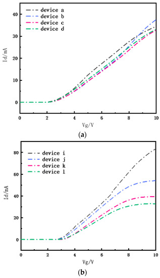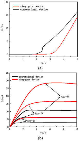When Vg = 6 V, the output characteristics of conventional and ring-gate HEMT devices with Lg of 3/4/5/6 μm are shown in Figure 9a,b. It can be seen that when Lg of the device increases sequentially, its saturation drain current decreases instead. In conventional structure devices, the Idmax when Lg = 3 μm is 17.77 mA, when Lg = 6 μm, the saturation current is reduced to 16.21 mA, in ring-gate devices, the saturation current decreases more significantly, from 51.28 mA when Lg = 3 μm to 24.48 mA when Lg = 6 μm. This is due to that the longer the gate length, the larger the width of the depletion layer under the gate, resulting in a lower 2DEG concentration, which further reduces the output current. Moreover, the increase of Lg will also lead to increased channel resistance, longer carrier path and the occurrence of knee voltage effect, resulting in decreased drain current [16,17].